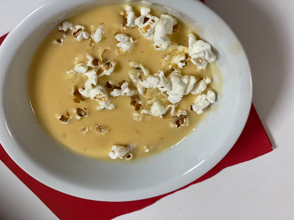 Garnishes: popcorn, croutons, minced parsley, chives, chopped green onion, crumbled bacon, additional shredded cheese