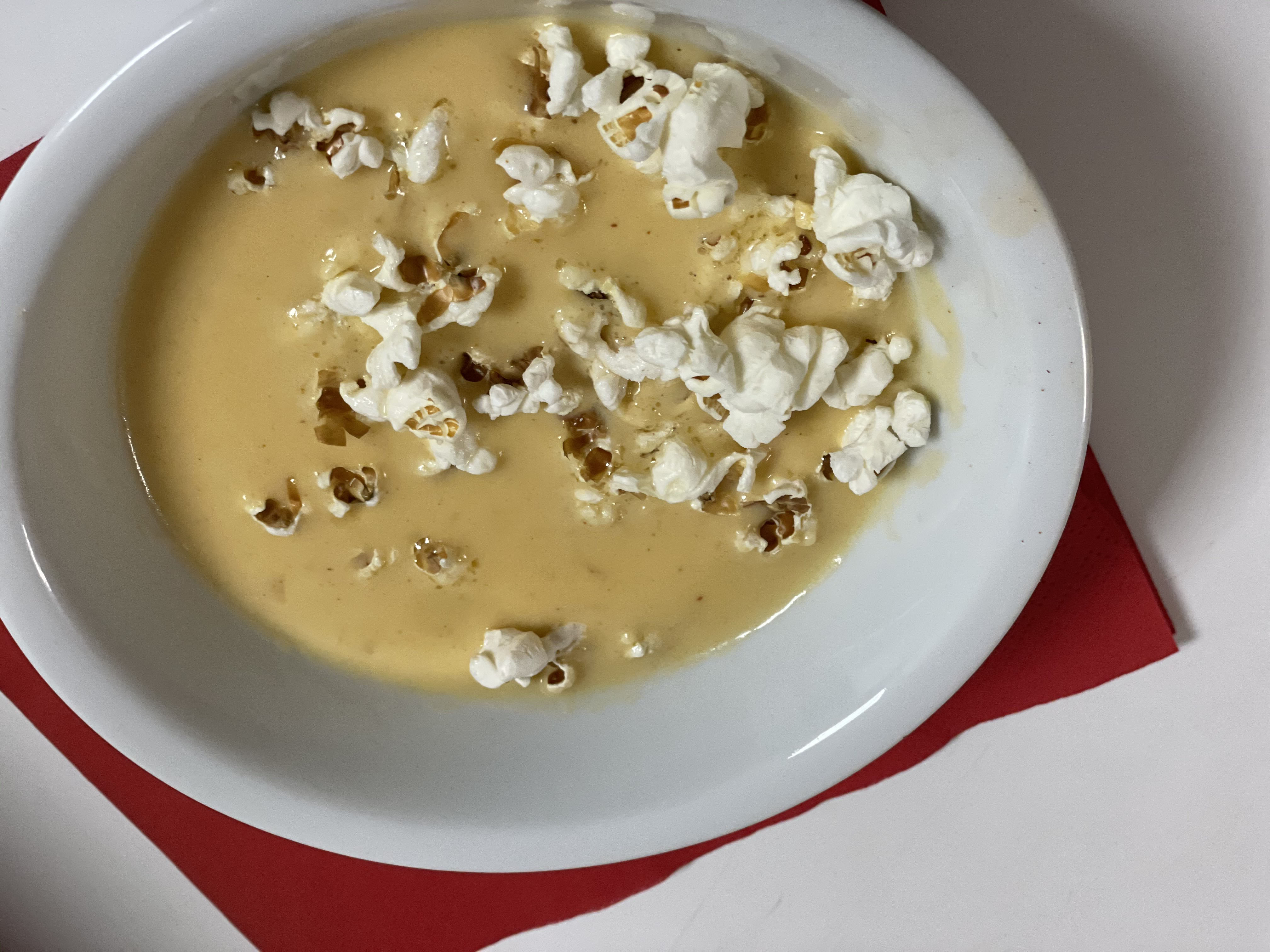 Garnishes: popcorn, croutons, minced parsley, chives, chopped green onion, crumbled bacon, additional shredded cheese
