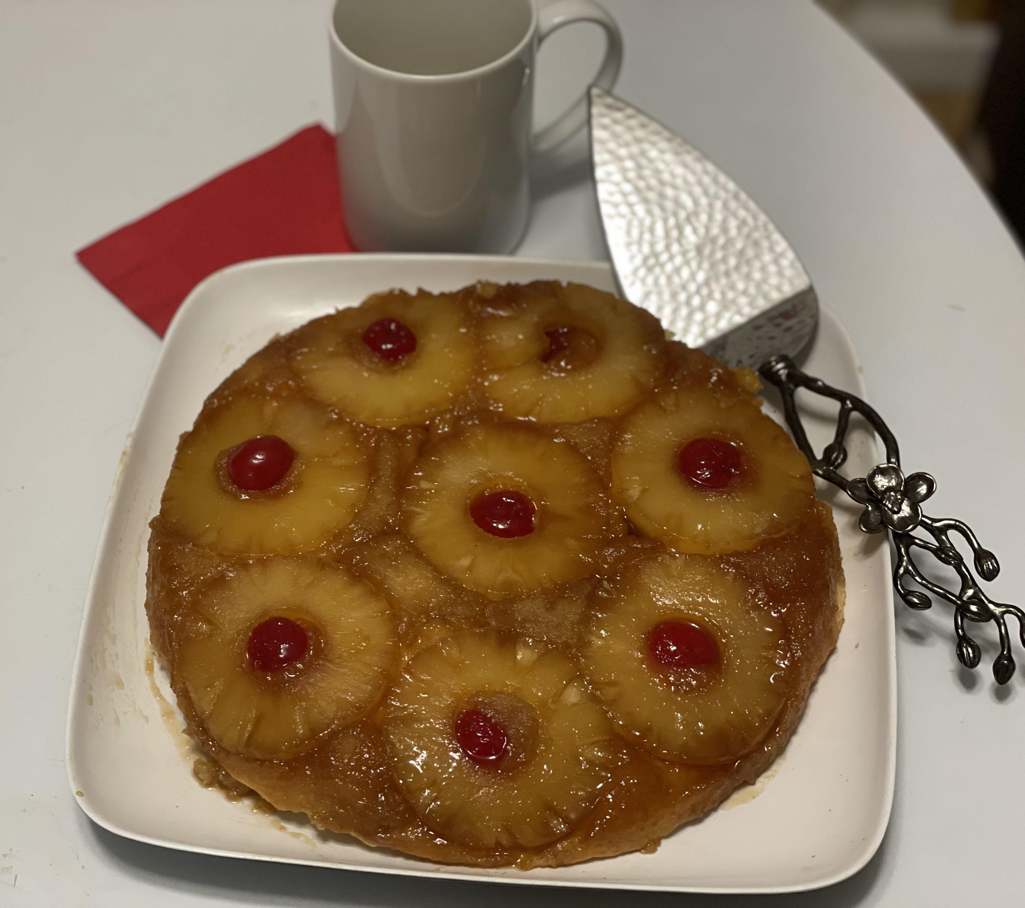 Follow the first two lines in the recipe using the added ingredients as above. To make batter: combine flour, baking powder, eggs, butter (softened), sugar and pineapple juice (drained from can) in a mixing bowl – use either stand mixer or hand variety – beat 1 to 2 minutes or until ingredients are well combined. Batter will be thick. Drop by spoonfuls over pineapple slices in skillet, spreading to completely cover fruit slices. Yes, bake at 300 degrees but you will need to add a good 10 – 20 minutes to the baking time. Toothpick inserted in the cake’s center should come out clean. Let cake cool to the touch – about 20 minutes. Run a knife around inside of the skillet to loosen edges. Place platter larger than skillet over the top and quickly invert cake onto platter.