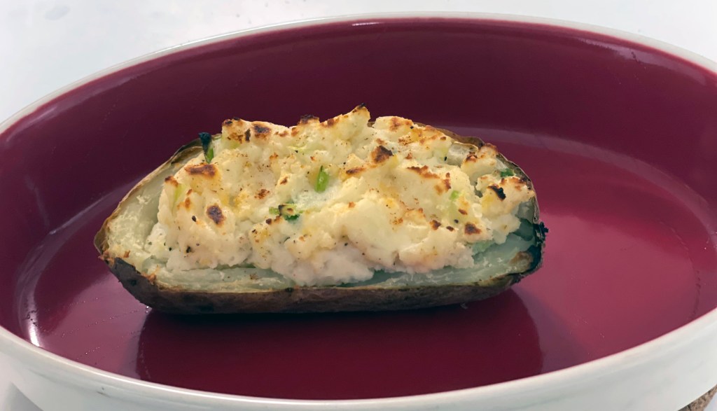I opted to try this recipe because potatoes always get a bad rap! Potatoes are actually good for you – rich in vitamins, minerals and antioxidants. Minus the traditional gobs of butter and sour cream, this lightened up version is quite tasty!