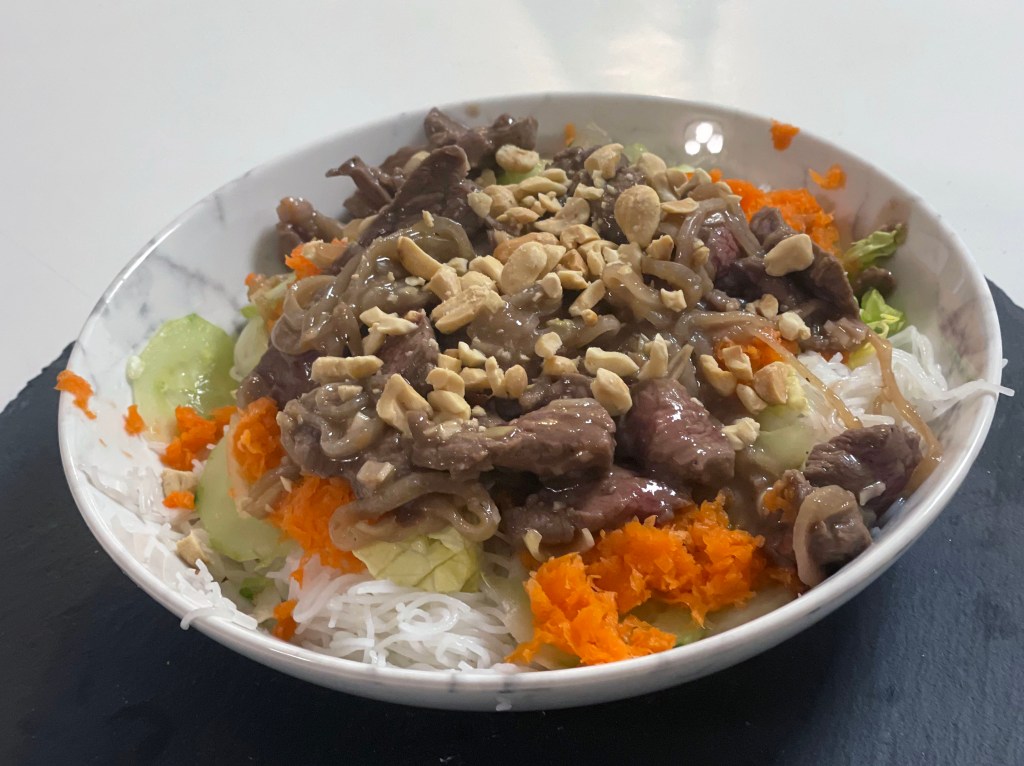 Divide lettuce, cucumber into each bowl. Divide cooked meat mixture between the four bowls (or less) and sprinkle 2 tablespoons chopped peanuts over each. Serve with Nuoc cham – recipe follows.