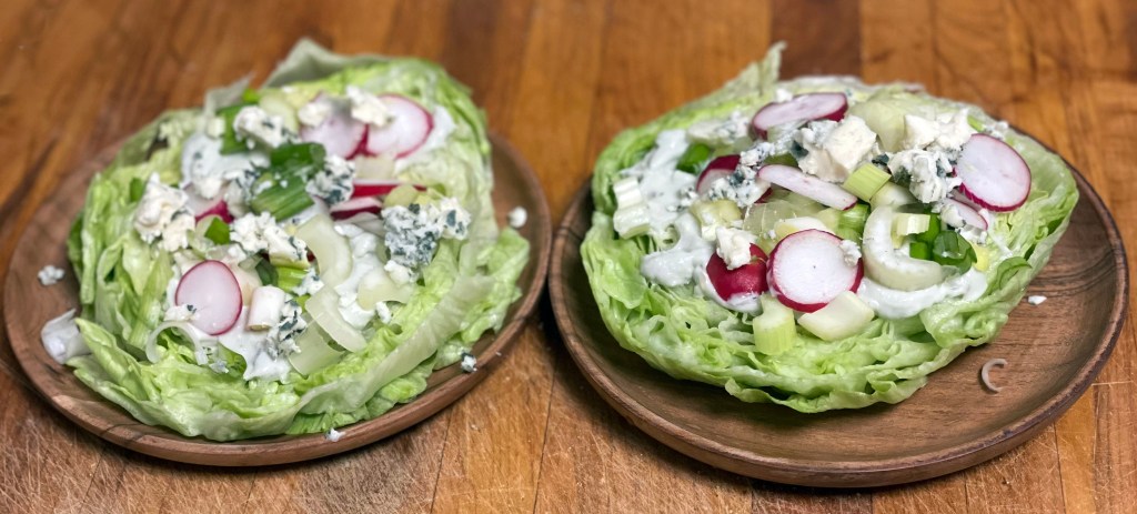 I was wrong. Not only is the presentation of sliced rounds of lettuce striking, the lettuce stayed crispy and flavorful under the dressing and accoutrements. Not a blue cheese lover (I wasn’t either once upon a time)? Use your favorite dressing; keep the toppings and presentation!
