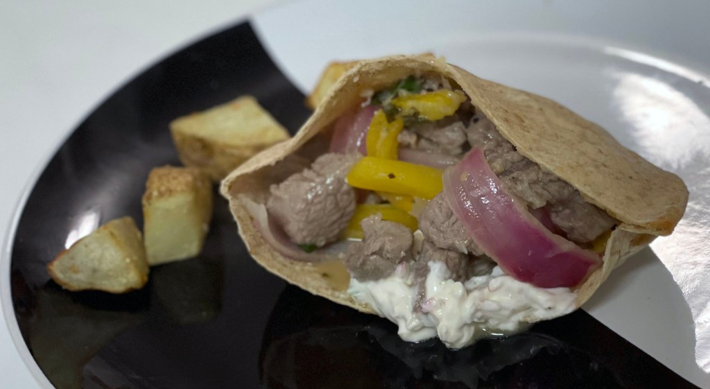 Note: I cut large pitas in half and “stuffed” them with the pork and vegetables and topped with the tzatziki sauce.