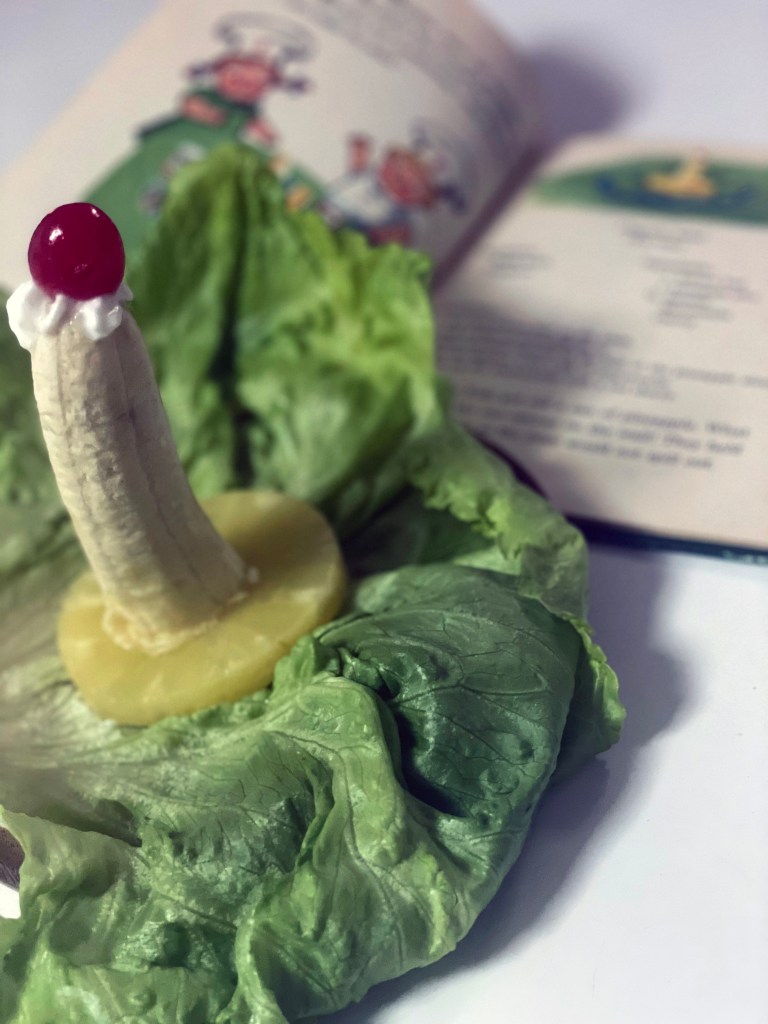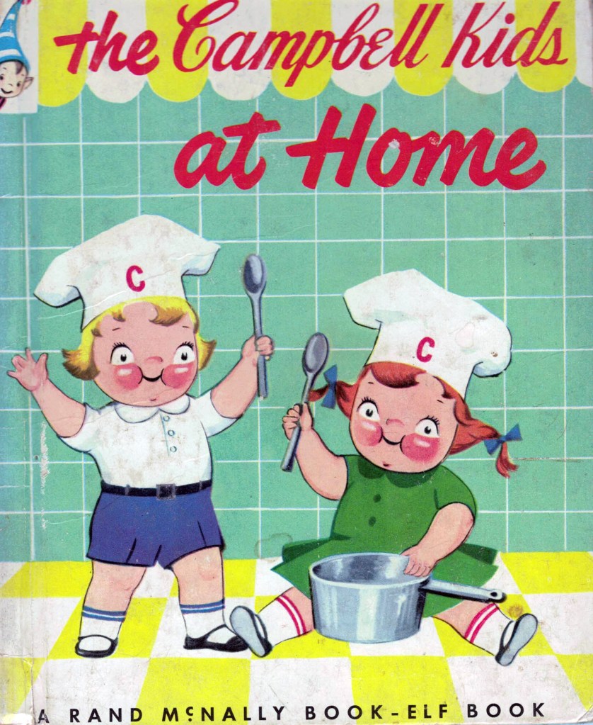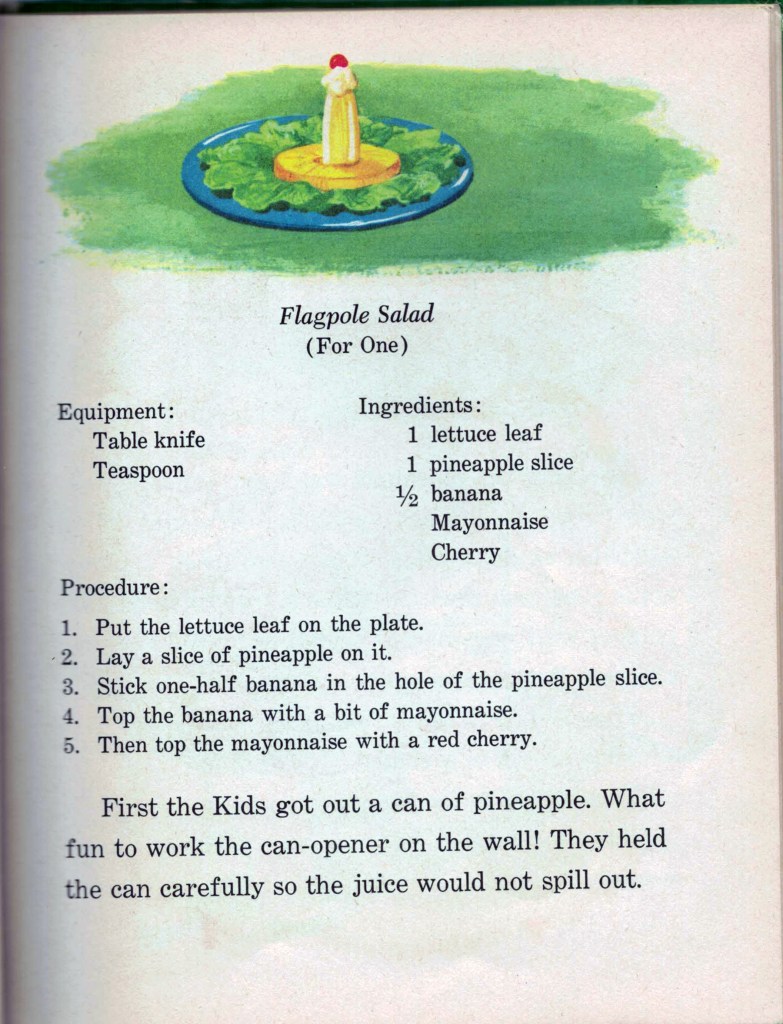 The Campbell Kids at Home (1954) doesn’t bill itself as a cookbook but it does include several recipes, – peanut butter sandwiches, hot cocoa and the salad. The book finds those apple-cheeked Campbell kids (yes, they used to be the face of Campbell’s soups, etc.) preparing lunch while their mother finished her sewing. What I remember as a “candle salad” is actually a Flagpole Salad (for one). I cannot begin to express how happy I am having this book back in my possession. I joked with my husband, “who knows, maybe it is “my” book.