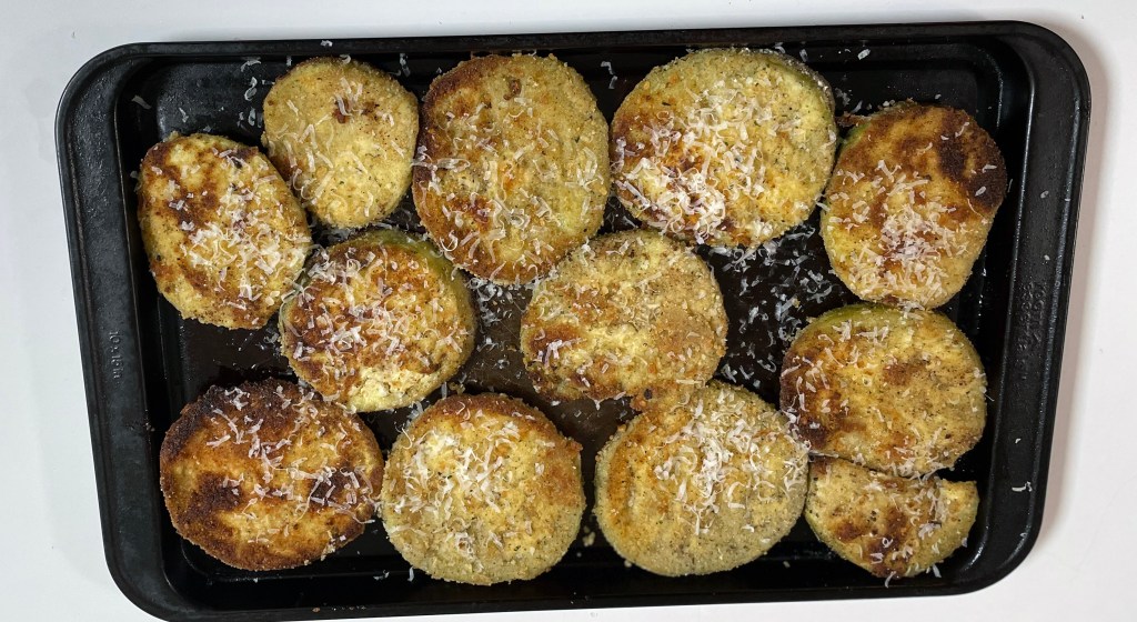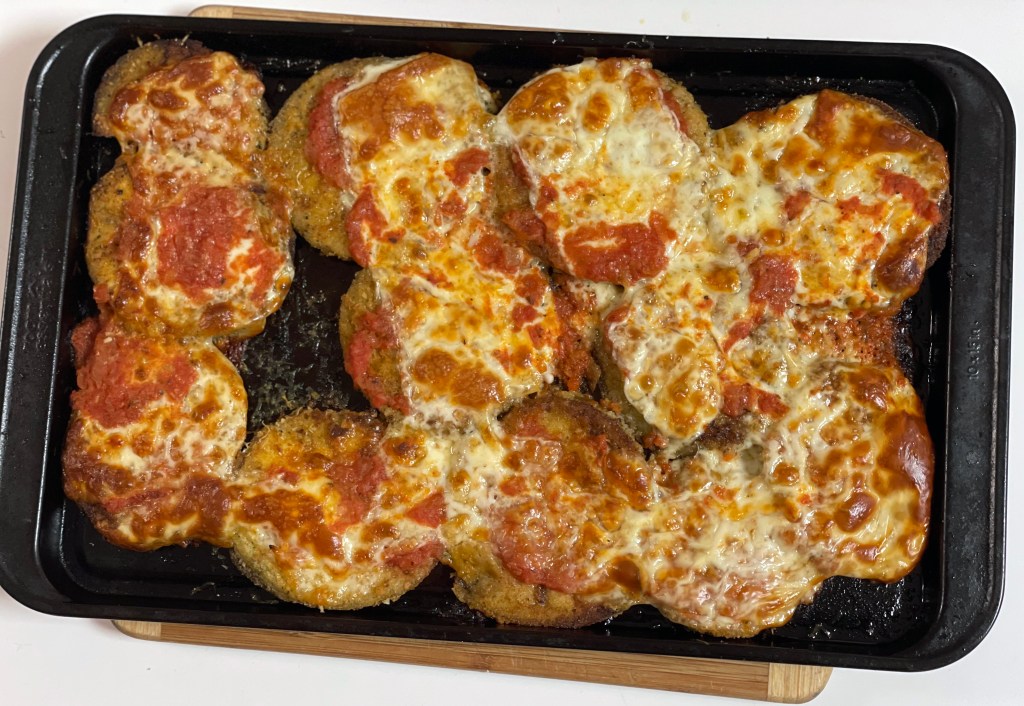 Cook’s notes: I used bread crumbs and liberally seasoned them with spices. I used fresh Parmesan cheese and sliced (with my mandoline) a block of Mozzarella cheese. And I wasn’t stingy about that cheese – see pictures below. The more cheese, the more gooey, melting goodness so each slice as as good as the next (unlike pizza). I keep frozen containers of homemade spaghetti/pizza sauce in the freezer. Let me know if you would like my favorite sauce recipe. You can easily sub in a good jarred or canned sauce.