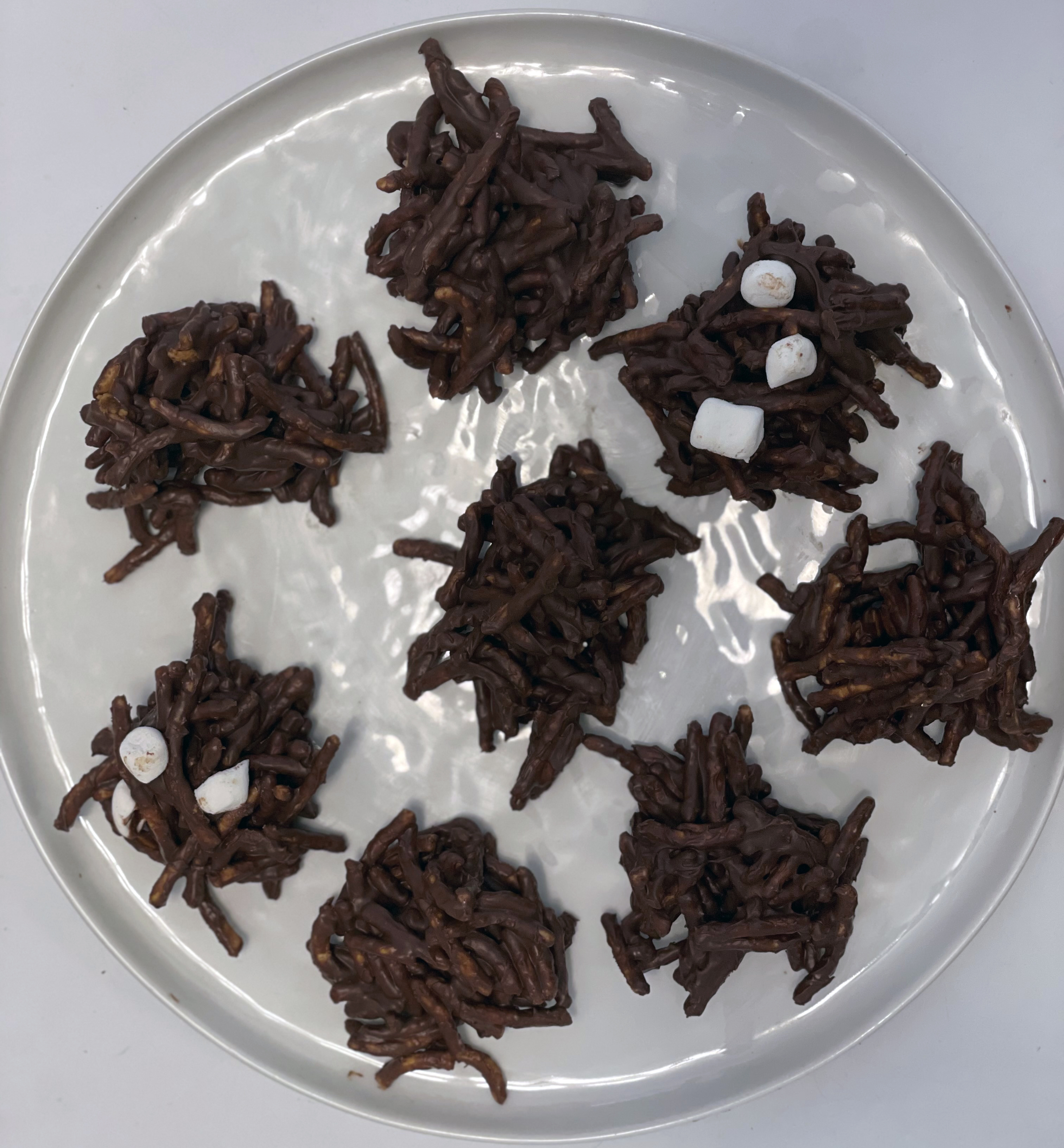 I am finally going to see my three grandchildren face to face in May. It’s been a year since I’ve seen them – except on FaceTime. Like I always do when they visit, I plan Camp Nonnie which always includes crafts, cooking and games and more. Searching for ideas for the next camp “session” I came across several books by Vicki Lansky in my collection. Lansky was a best-selling author and publisher of cookbooks, parenting books, and household tips books; she passed away in 2017. Today I’m sharing her recipe for bird nest clusters from Vicki Lansky’s Kids Cooking (1987). They are an instant snack and one even little hands can master. Add marshmallow (eggs) or colorful jelly beans (think Easter). Vary the chips you use – try butterscotch and milk chocolate. And of course, if my grandchildren were making them, they would ask to add sprinkles!
