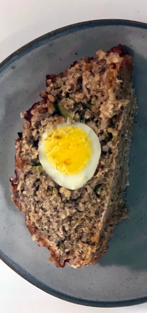 Note: I always tuck in a hard-cooked egg or two into meatloaf – something my mother did as well!