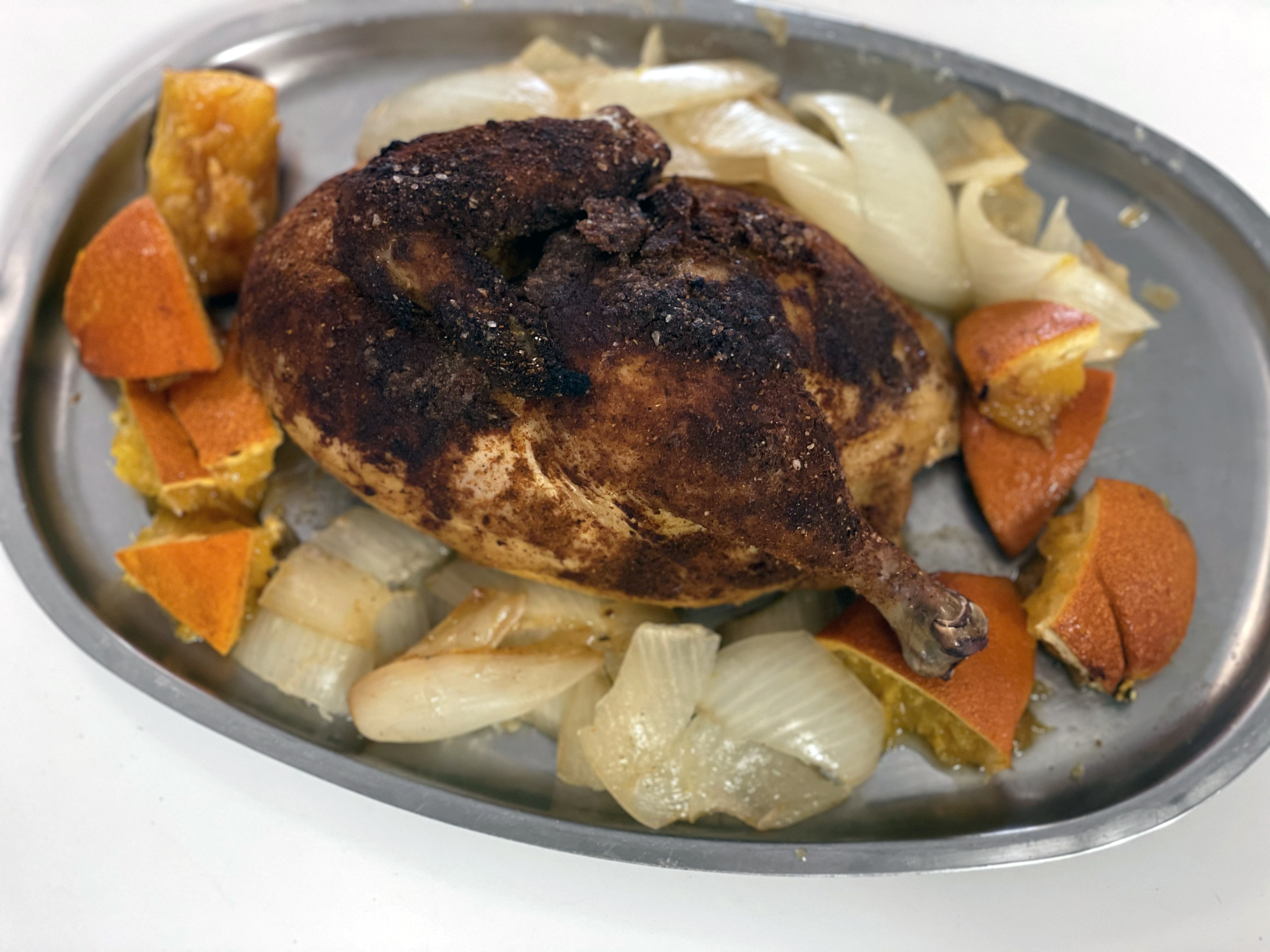 Preheat oven to 425 degrees. Pat chicken dry with paper towels. Place chicken in a roasting pan. Cut lemon in half and rub one half over surface of chicken. In a small bowl, mix spices together and sprinkle over chicken. Squeeze juice from lemon half and from one of the oranges into roasting pan and add water. Place remaining orange, whole and unpeeled, in chicken cavity. Cut onions in half and add to pan. Cook chicken for 15 minutes, then baste with the pan juices and lower heat to 350 degrees. Cook for 1 hour, basting after 30 minutes. Remove orange from cavity of chicken. Cut orange and onions into small pieces and serve with chicken here.