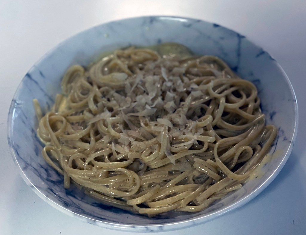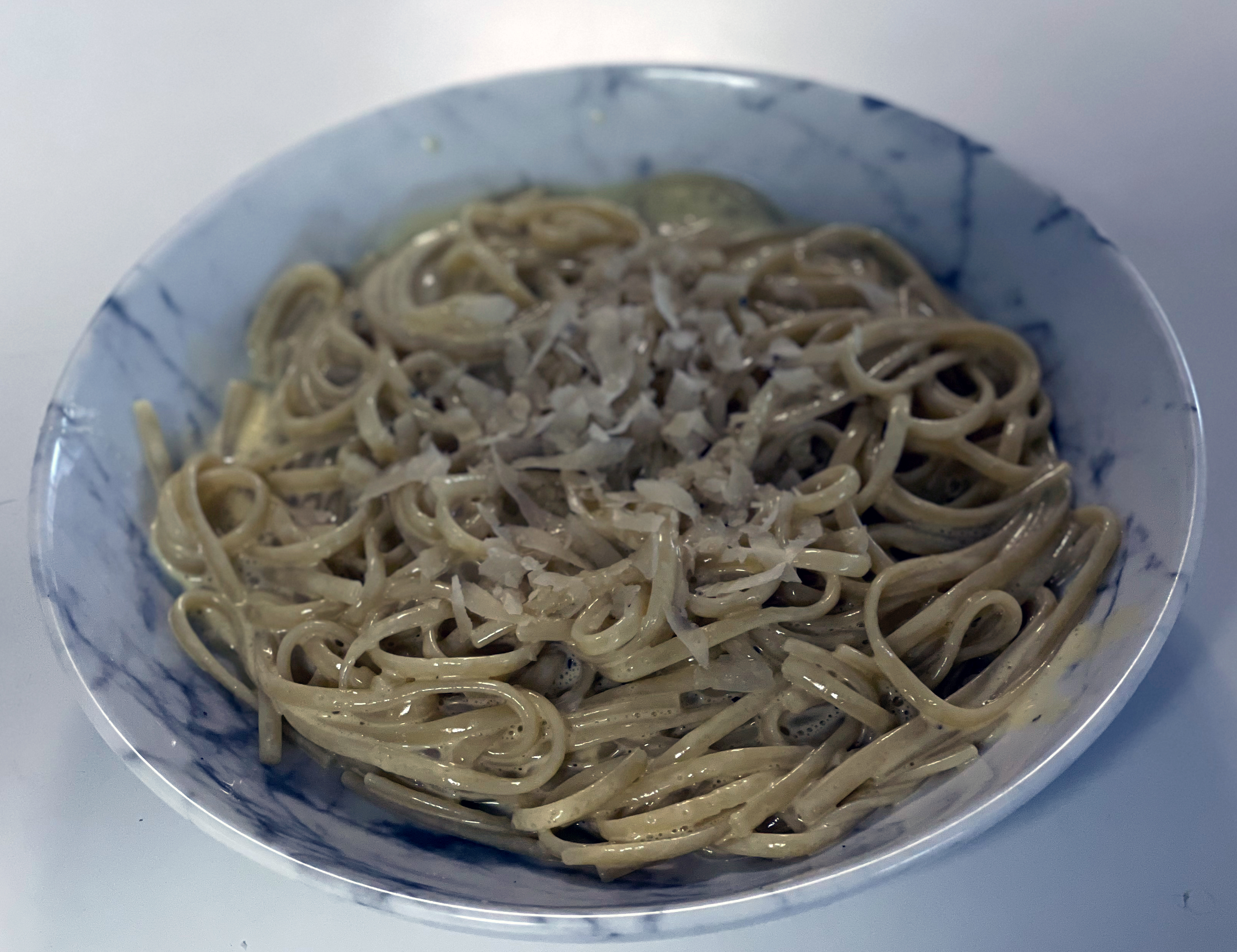 Plunge 1 pound of thin egg noodles into rapidly boiling water for 8 minutes or until tender. Drain well and toss in pan over low heat until quite dry. Tossing constantly, add 2 tablespoons butter, 1 cup heavy cream, 2 egg yolks, pinch of salt and freshly ground pepper. Finally when quite hot, add 4 tablespoons of good Parmesan cheese (I recommend Parmigiano-Reggiano) and continue tossing until well blended. Dish into individual dishes and sprinkle lightly with more Parmesan.