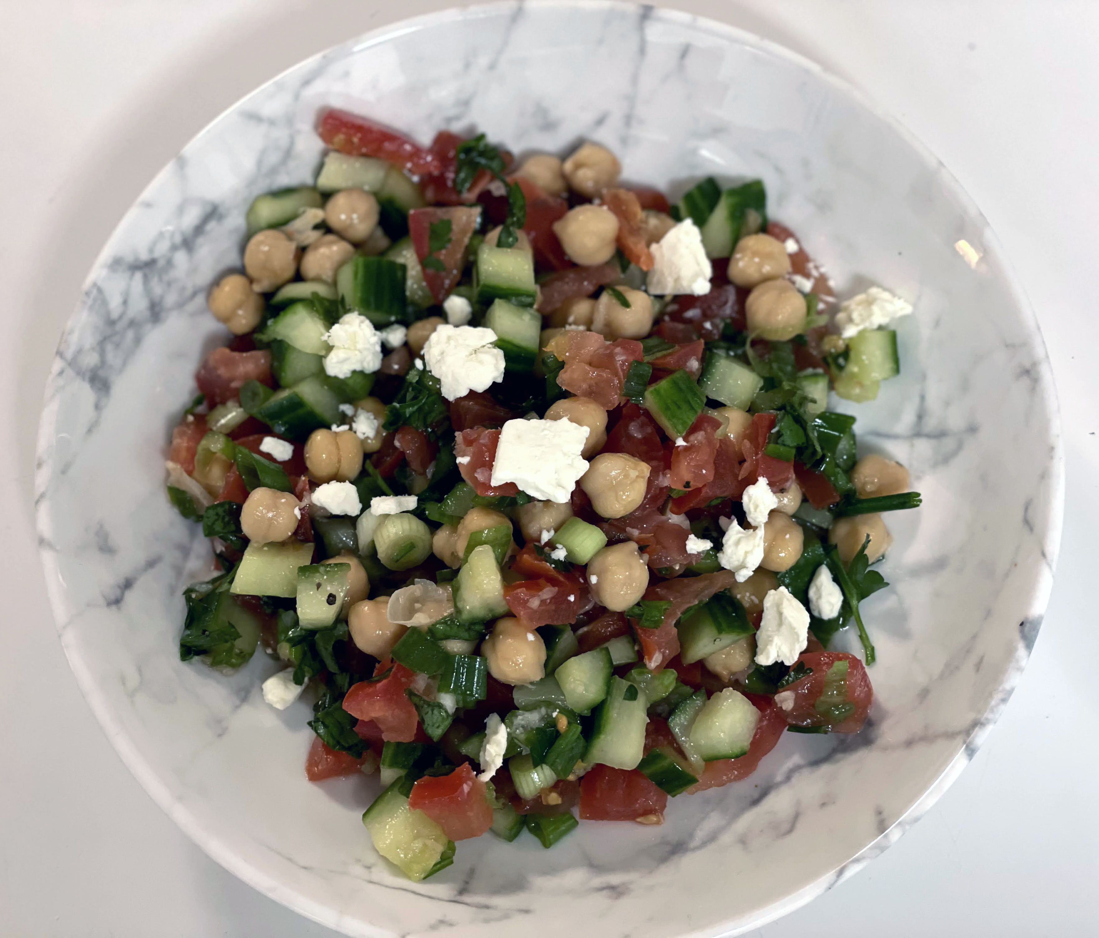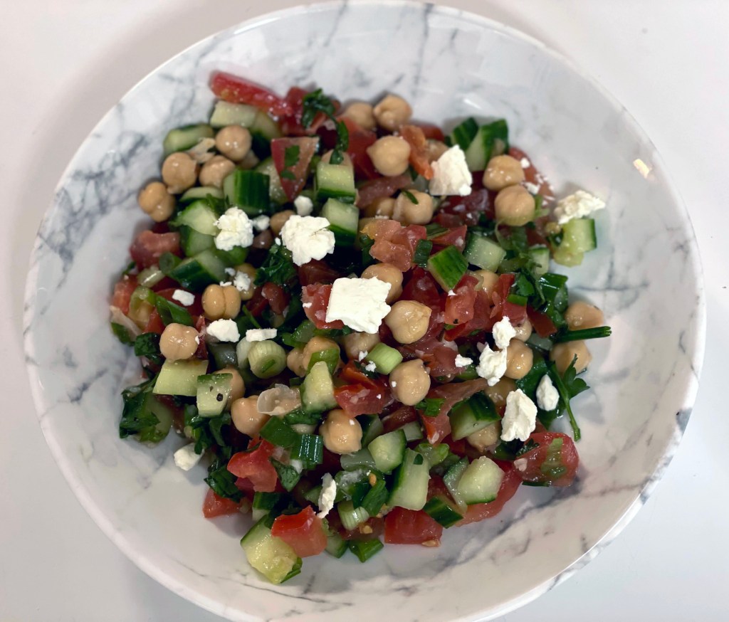 Place the scallions, tomatoes, cucumber, chickpeas, parsley, mint, and basil in a large salad bowl and toss to combine.
