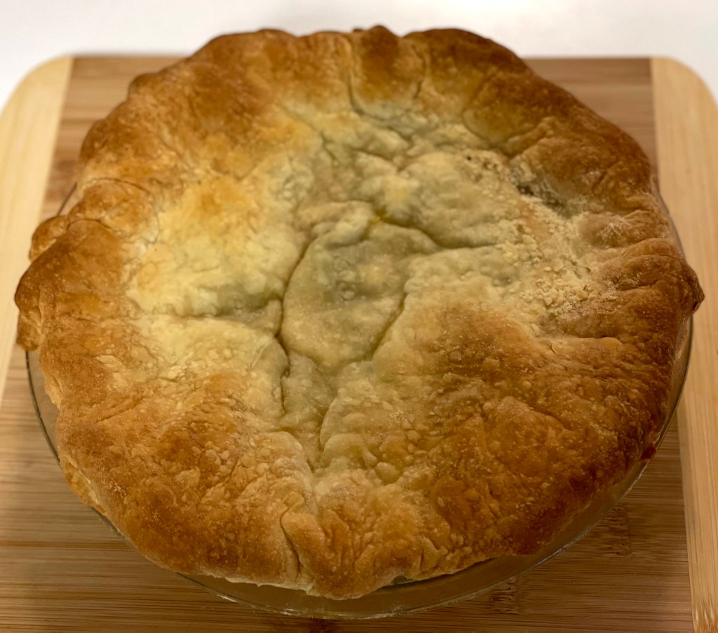 Roll out the second sheet of pastry, again making it ⅛-inch thick. With your fingers or a little pastry brush, brush the edge of the lower pastry shell with a little water. Gently place the second sheet of pastry on top of the pie, press the edges firmly together, and cut off excess pastry. Flute the edges by pinching the pastry gently between your thumb and forefinger. Cut a few small slits in the middle of the top crust.