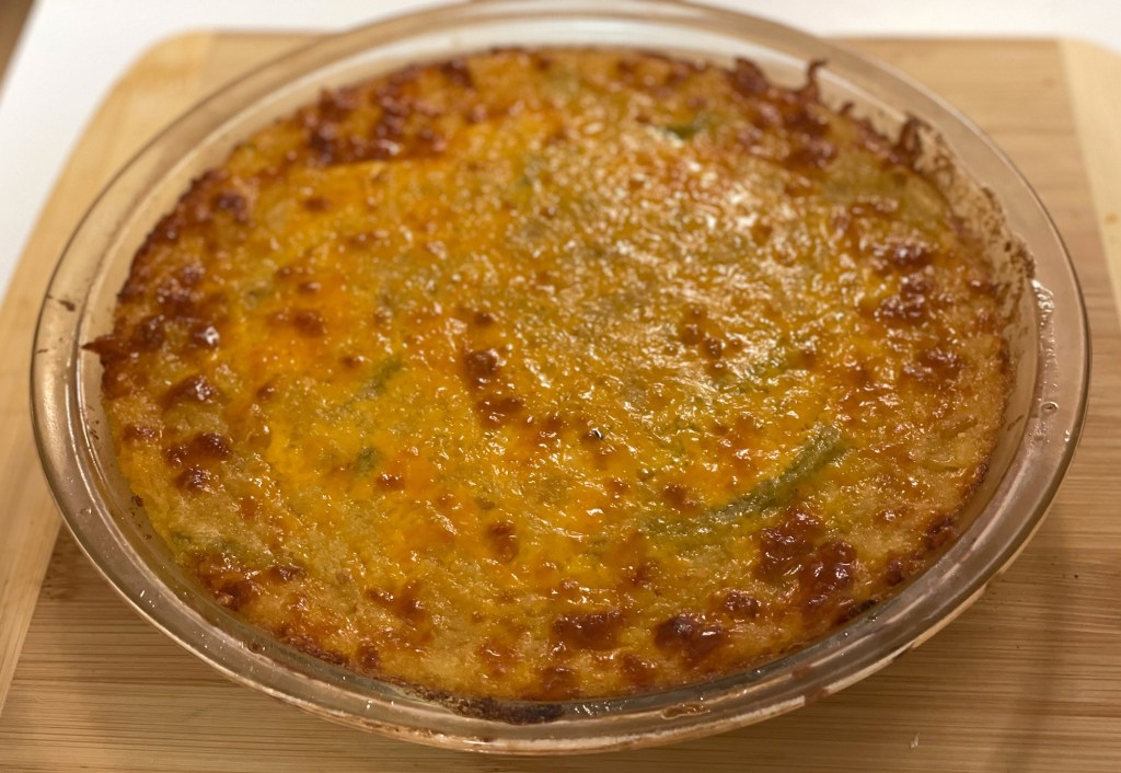 Sometimes it’s fun to have an added attraction on the table – aside from the customary potato, veggie or other side dishes. This recipe for corn pie from From Noodles to Strudels (1972), a project of the Beverly Hills Chapter of Hadassah, is THAT DISH. Savory with just the right amount of spice, this pie could just as easily be served as an appetizer or as a side dish for meat, fish or fowl! Feel free to use chopped chili peppers if you can’t find whole ones. Certainly you can use fresh peppers, but the beauty of this pie is that it is made with ingredients you probably already have in your pantry. Note, this is not a pie you cut in slivers! Serve it with a big serving spoon to dish out – or provide a basket of corn chips to scoop with. You can still find used copies of this fun book on Amazon.