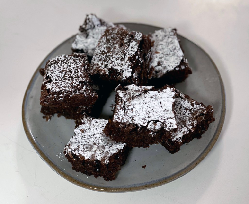 I couldn’t resist trying yet another brownie recipe. If you’ve been reading my cookbook blogs, you already know the first attempt was a dud. Dry, tasteless brownies – despite the fact they looked good! I found this recipe in Adath Caters to You, a cookbook compiled by the Sisterhood of the Adath Jeshurun Synagogue (1983) in Minnetonka, Minnesota. The promise of “double fudge” really hooked me. But on reflection the recipe merely calls for a package of chocolate chips! Still I was undeterred. Appearance. Check. Ease in cutting. Check. Chocolatey Aroma. Check. Okay, while the recipe turned out a respectable pan of brownies (visually) – I detected bits of batter not thoroughly incorporated – see note below. Once again, try at your own risk. Next time I crave brownies, I think I will head to the grocery store for a mix.