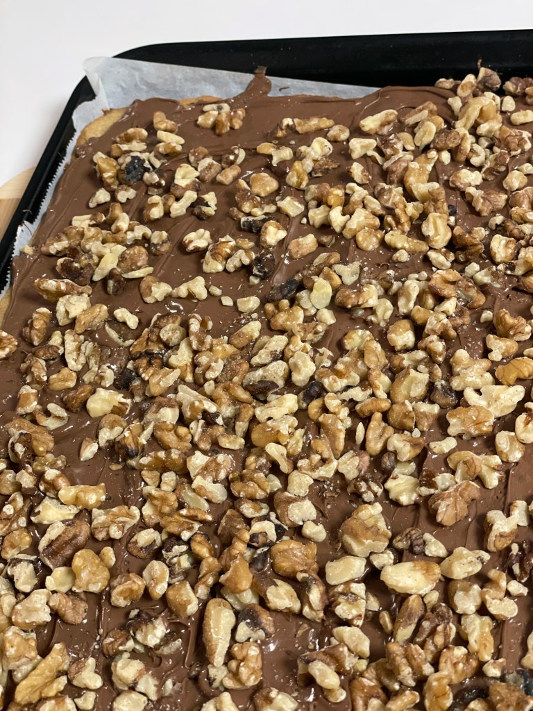 When removed from oven, sprinkle with ½ pound chopped milk chocolate (or a bag of milk chocolate chips). Spread to melt and sprinkle with chopped walnuts.