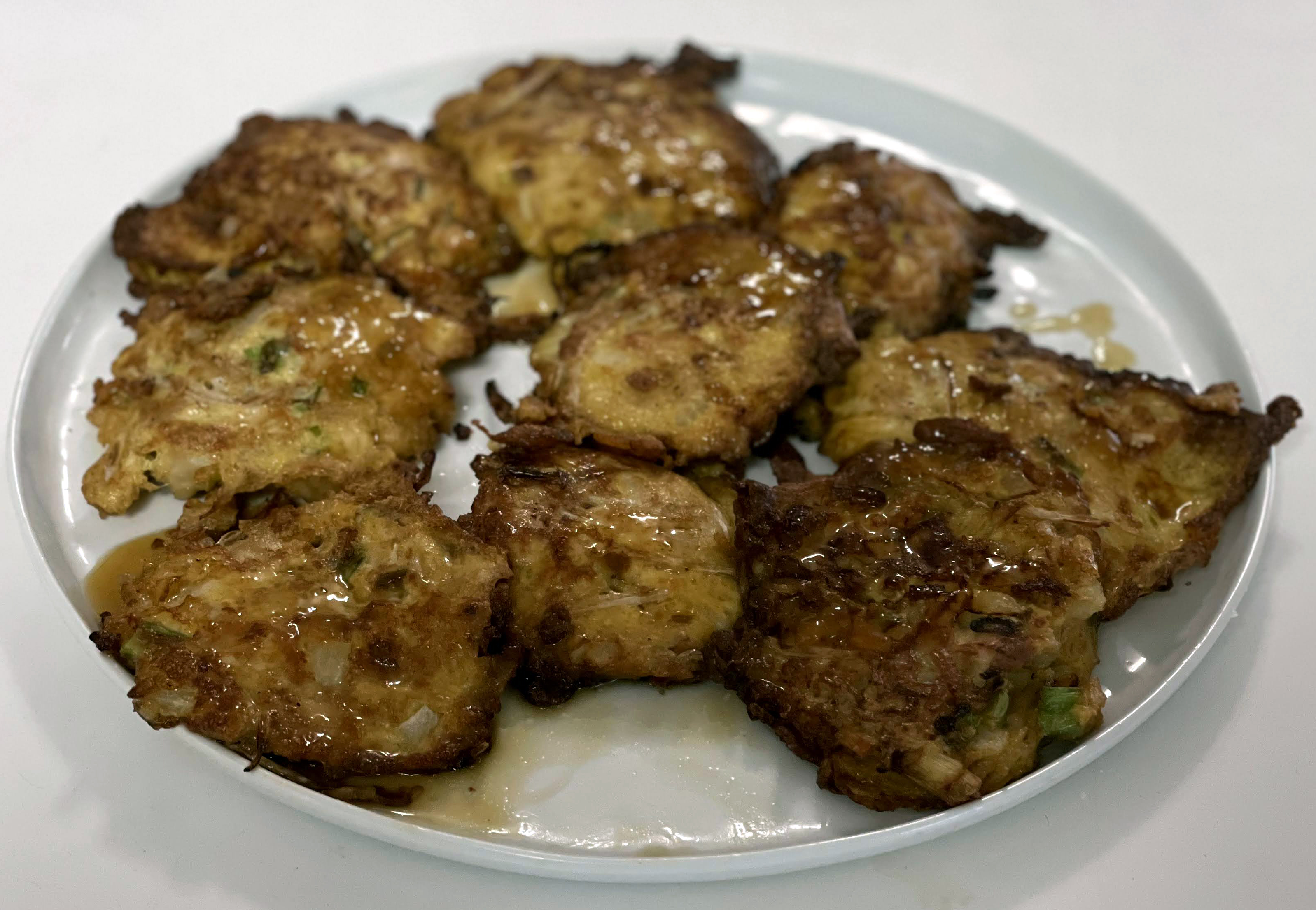 Lightly beat the eggs, salt and pepper. Stir in onions, meat or fish, scallions and 1 tablespoon soy sauce. Heat the oil in a skillet. use a ladle or ¼ cup of the mixture and drop into oil. Fry until browned on both sides. Drain.