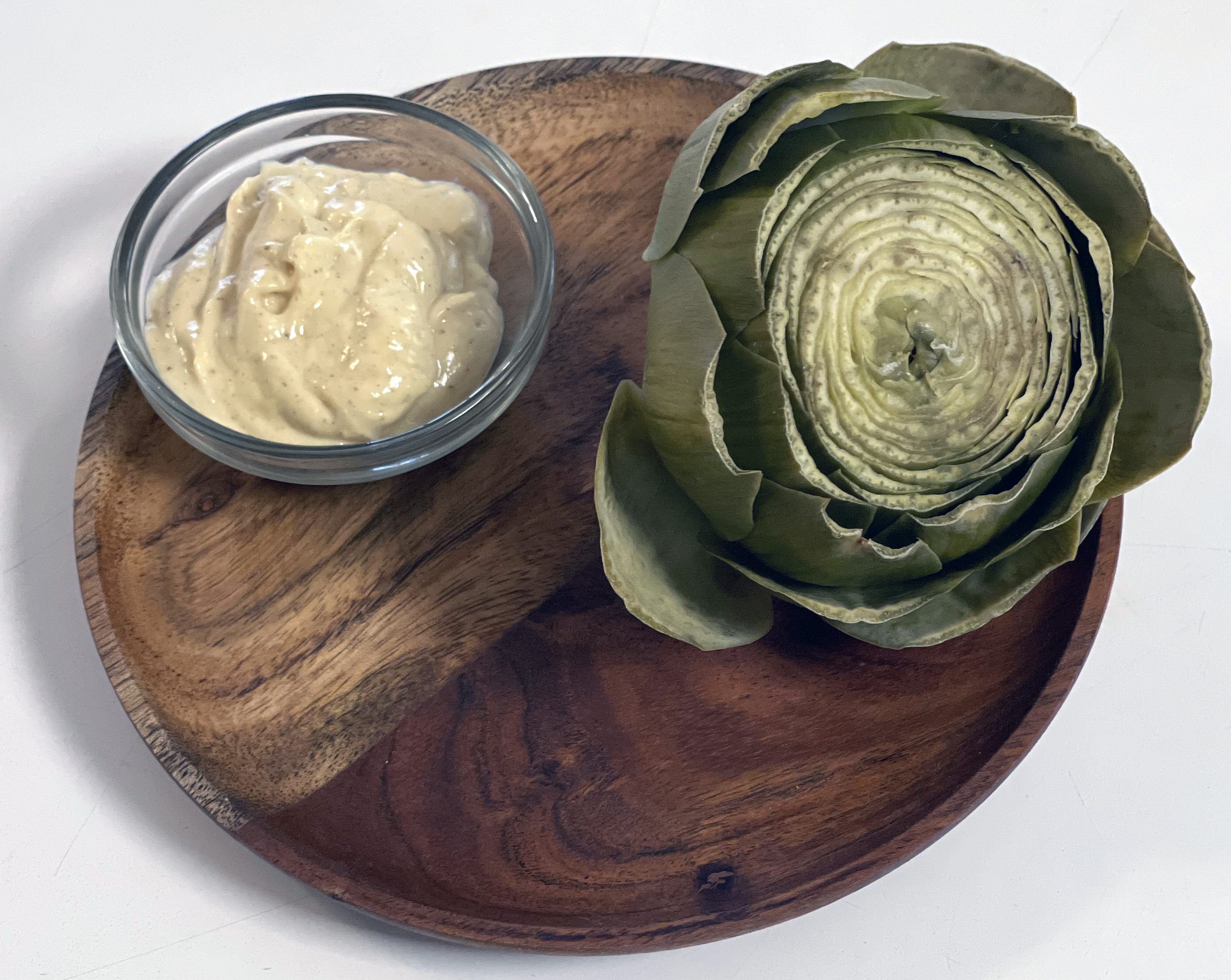 Wash thoroughly. Cut off the stem close to the leaves. Pull off the tough outer leaves. Cut off the prickly tops with scissors. Put in a deep saucepan with 1½ inches of boiling water (I have one of those collapsible metal steamer inserts that I use so the artichokes are not directly in the water). Add 2 tablespoons lemon juice or vinegar. Cover the pan. Cook until you can easily pull on an outer leaf (25 to 45 minutes – my artichoke was on the small side so it was ready in not quite 25 minutes) Drain upside down. Set upright on a serving dish. Serve hot with individual dishes of melted butter or Hollandaise in which to dip each leaf as it is eaten. Or serve cold with a Vinaigrette sauce or mayonnaise seasoned with lemon juice and prepared mustard. I made a sauce with a ¼ cup mayonnaise, 1 tablespoon lemon juice and 1 tablespoon Trader Joe’s Garlic Aioli Mustard.