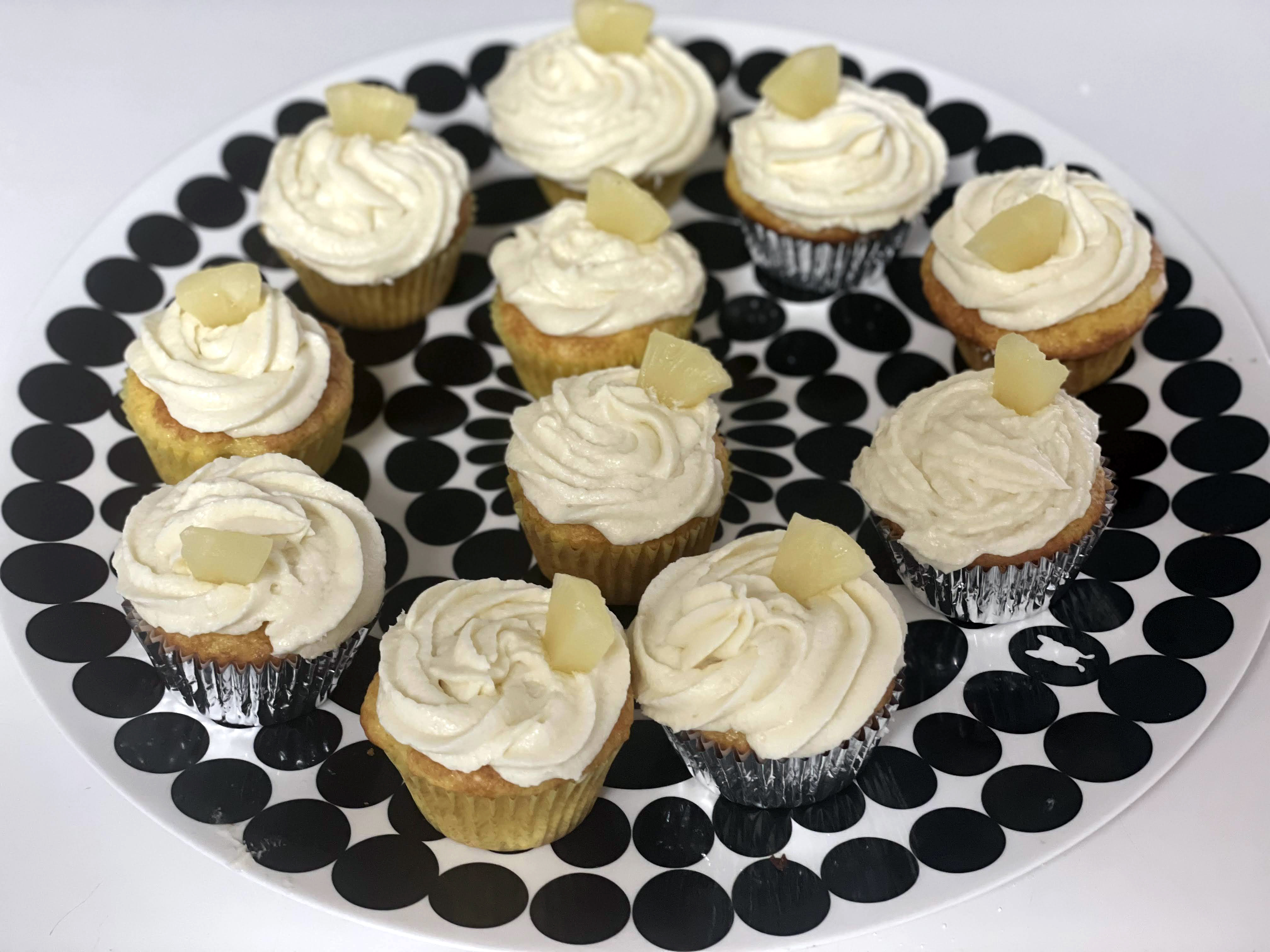 Preheat oven to 325° and line two cupcake pans with cupcake liners. In a large bowl using a hand mixer, mix cake mix with crushed pineapple, vegetable oil, and eggs. Beat at medium speed for 2 minutes. Pour batter into prepared cupcake pans and bake for 20 to 22 minutes or until a toothpick inserted in center of cupcake comes out clean. Transfer to a wire rack and let cool completely before frosting.